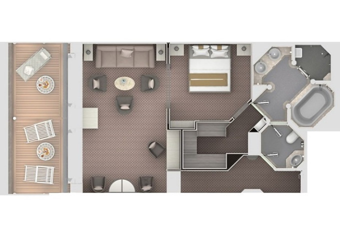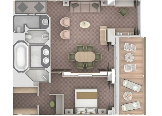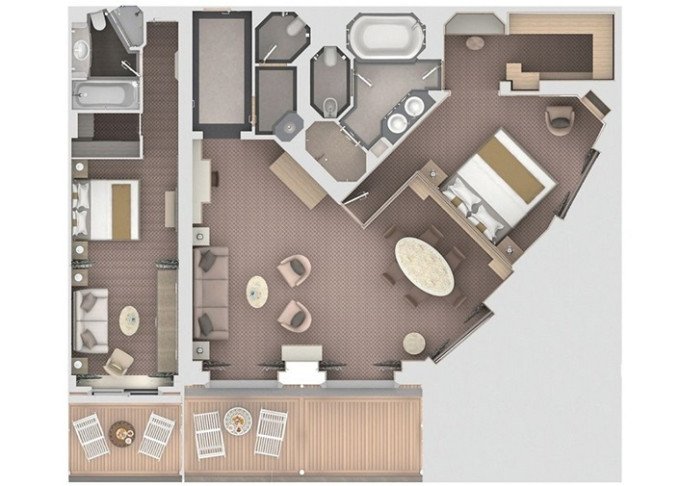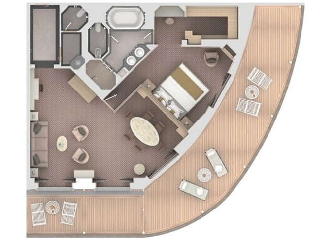 O2 - Owner's Suite 2 119 - 129 m² (vrátane veľkej verandy). Owners Suite O1 spojená s Panorama Suite. 9. paluba - stred. Max 5 osôb. 57 400 € 28 700 € za osobu