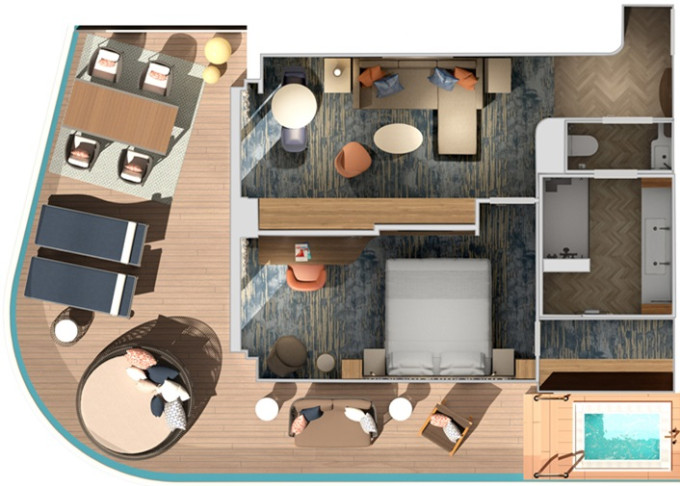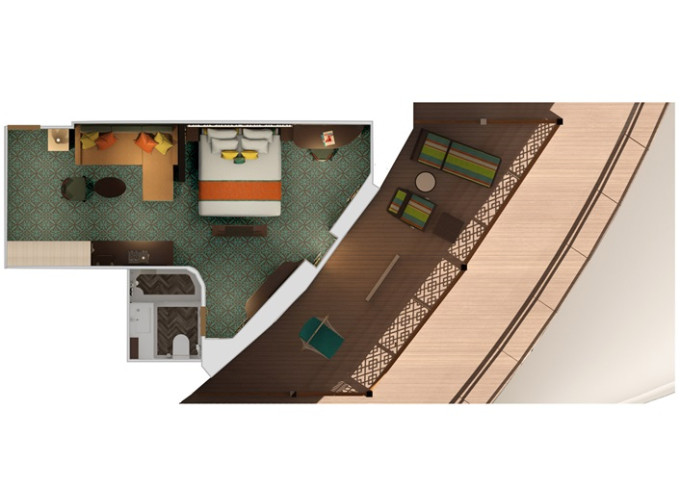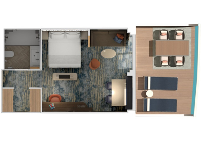 HS - Suite Havana Cabana 28 m² + vonkajšie patio 8 m². 8. paluba vpredu. Tropický štýl, vstup do exkluzívnej zóny Havana. Výhody Suite. Táto kajuta je určená pre hostá od 12 rokov. 2 288 € 1 144 € za osobu