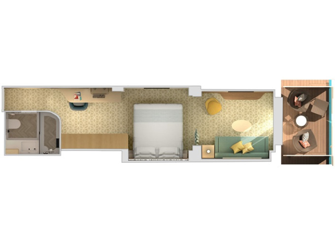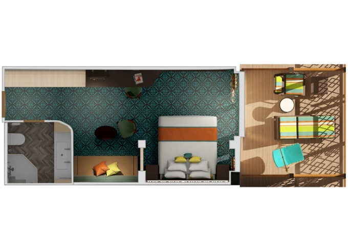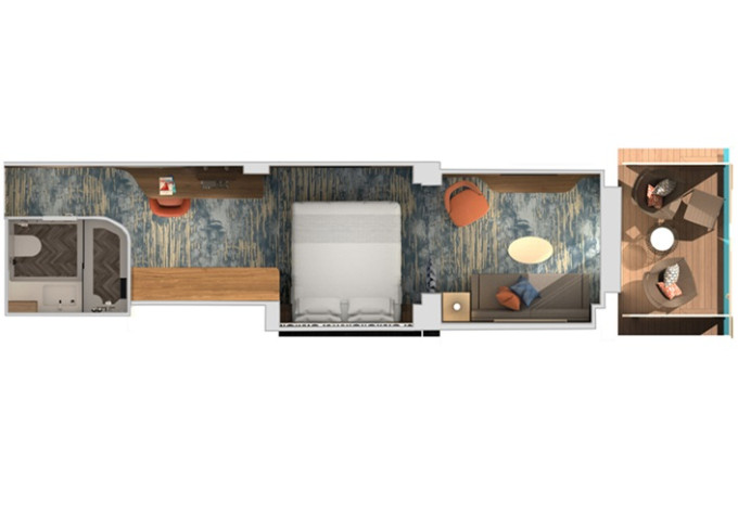 HE - Kajuta Havana Cabana s patiom 19 m² + vonkajšie patio 8 m². 8. paluba vpredu. Tropický štýl, vstup do exkluzívnej zóny Havana. 2 154 € 1 077 € za osobu