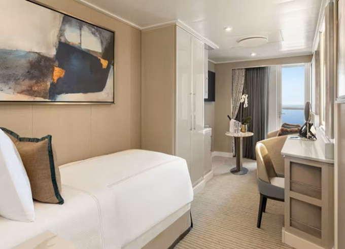 S - Kajuta s balkónom Concierge Solo 21 m² + balkón 4 m². 9. paluba. Max 1 osoba. Výhody kategórie Concierge. | 26 218 € 13 109 € za osobu |