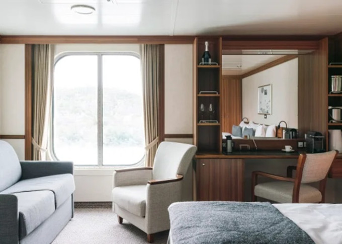 Q2 - Expedition Mini Suite 15-20 m². Veľké neotvárateľné okno. Obývacia časť, TV and mini-bar. Upper paluba. Max 2 osoby. Výhody Suite. | 20 666 € 10 333 € za osobu | ||