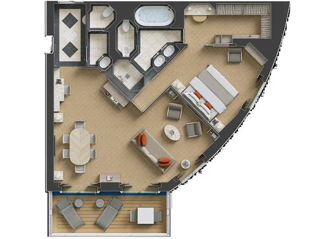 R1 - Royal Suite 1 105 m² (vrátane balkónu). 7. paluba vpredu. Max 3 osoby. | 24 600 € 24 600 € za osobu | ||