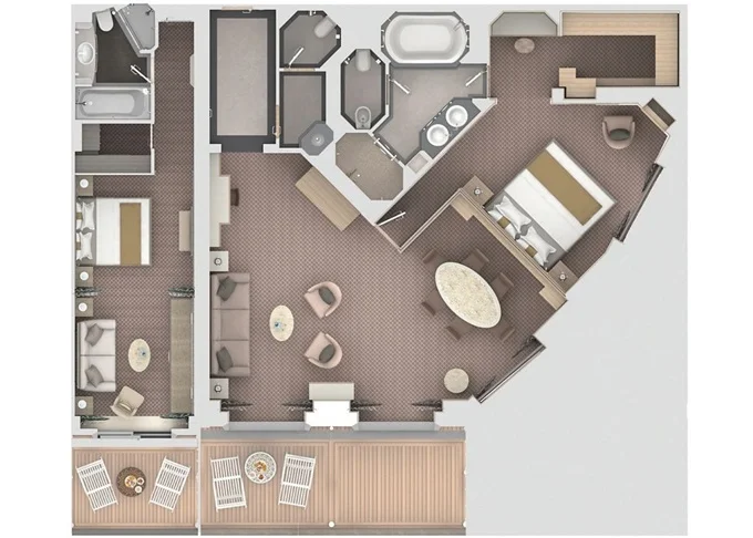 G2 - Grand Suite 2 137 m² (vrátane balkónov 44 m²). Grand Suite G1 spojená s Veranda Suite. 8,9. paluba vpredu. Max 5 osôb. | 55 400 € 55 400 € za osobu |
