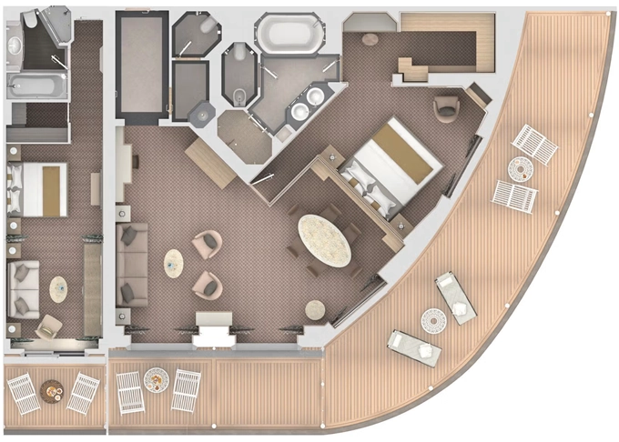 O2 - Owner's Suite 2 119 - 129 m² (vrátane balkóna 12 m²). Owners Suite S1 spojená s Panorama Suite PA 9. paluba - stred. Max 5 osôb. | 68 100 € 22 700 € za osobu |