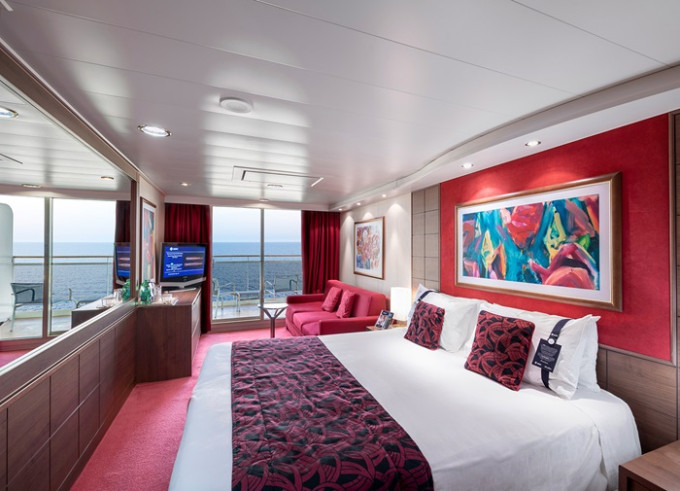 Suite s balkónom: cca 31m² kajuta s manželskou posteľou (na požiadanie 2 oddelené postele) a rozkladacia pohovka. Klimatizácia, kúpeľňa s vaňou, toaletný stolík, priestorná skriňa, TV, telefón, minibar, sejf, sušič na vlasy. Balkón so stolíkom a stoličkami. Internetové pripojenie (za poplatok).