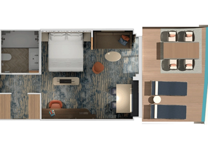 HU - Suite Havana Cabana Corner 33 m² + vonkajšie rohové patio 15 m². 8. paluba vpredu. Max 3 osoby. Tropický štýl, vstup do exkluzívnej zóny Havana. Výhody Suite. 5 050 € 2 525 € za osobu